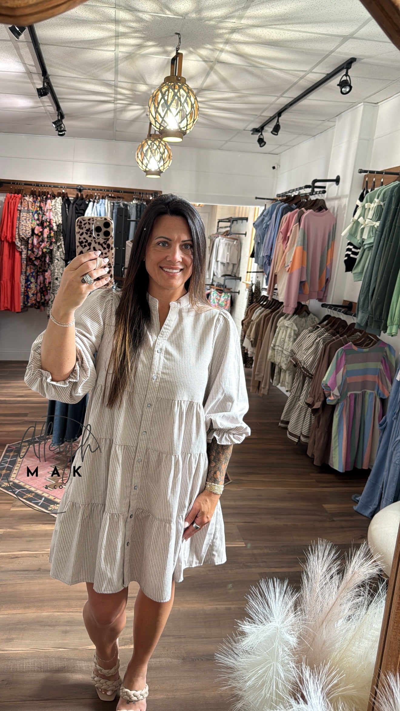 Chic and comfortable taupe striped woven dress features a button-down front, a flattering tiered silhouette, and convenient side pockets. Designed with a lightweight linen finish. Casual yet elevated, this dress is a versatile piece you'll reach for all season long.