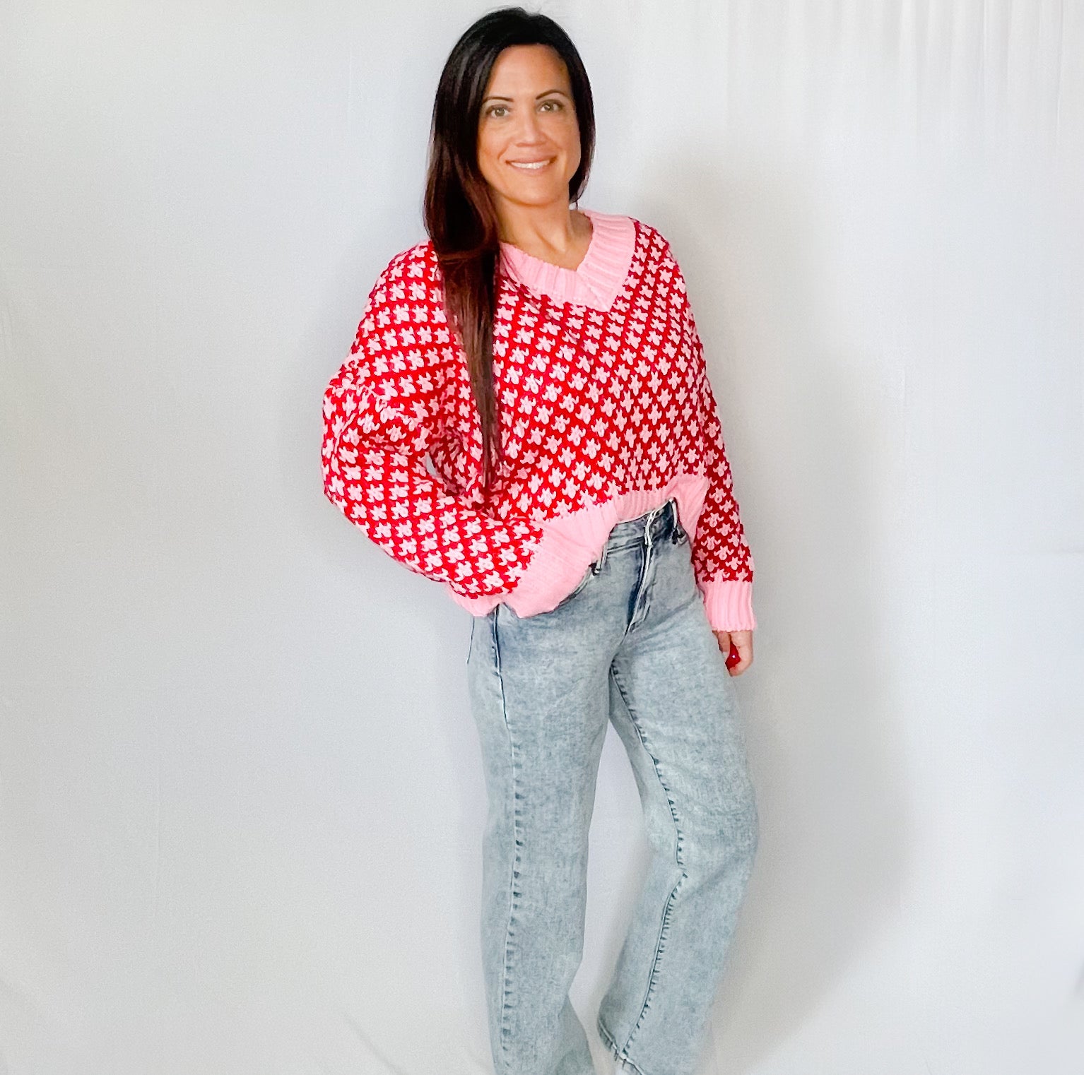 Add a pop of color to your cold-weather style with this cozy textured color block sweater. Featuring bold red and soft pink hues, this knit offers a playful yet chic look perfect for any occasion. Designed with a relaxed fit, ribbed hems, and a soft-touch fabric that keeps you warm and comfortable all day. Pair it with your favorite jeans or a mini skirt for an effortlessly stylish outfit.